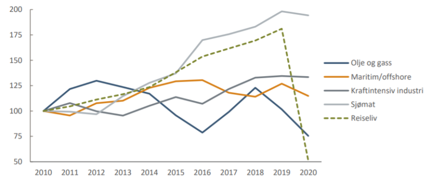 - Sysselsettingen forventes ikke å være tilbake til 2019-nivå før i 2030. En betydelig nedgang forventes innen transport og overnatting