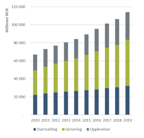- Samlet omsetningen i norsk reiselivsnæring var 206 milliarder kroner i 2019. Nordmenn stod for 82% og internasjonale gjester stod for 18%. Fordeling kundesegment og forbruk pr. bransje:
