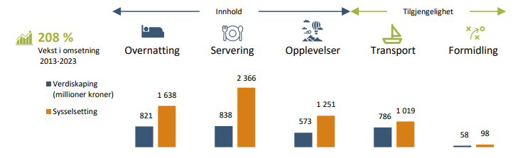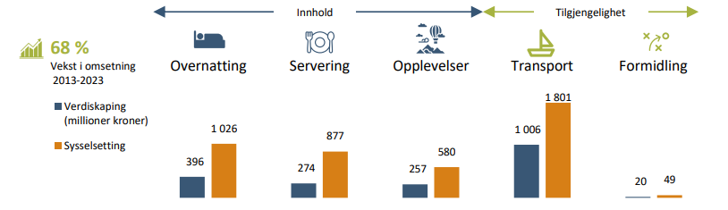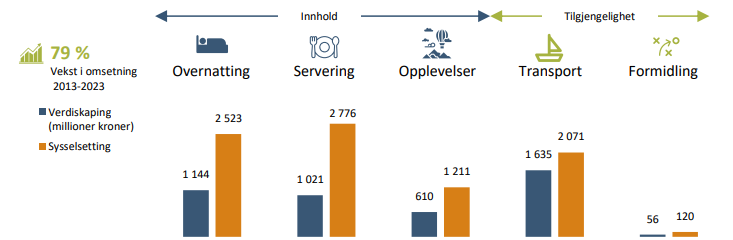 Reiselivet totalt står for 7% av verdiskapingen og 14% av sysselsettingen i næringslivet. Fra 2021 har omsetningen i reiselivet økt kraftigere enn tidligere år. De fem reiselivsbransjene hadde en samlet verdiskaping på 2 milliarder kroner og en