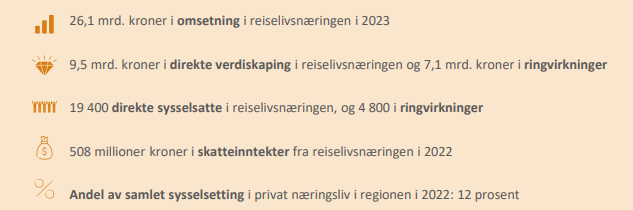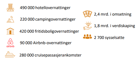 Reiselivet totalt står for 4% av verdiskapingen og 11% av sysselsettingen i næringslivet. Omsetningen i reiselivet har økt jevnt og trutt siden 2013, bortsett fra under pandemien. De fem reiselivsbransjene hadde en samlet verdiskaping på 4,5 milliarder kroner og en sysselsetting på 8 700 personer. Reiselivsbedriftene genererer 235 millioner kroner i skatteinntekter til kommunene.
