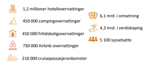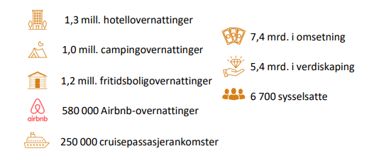 Det har vært vekst i samtlige overnattingssegmenter i regionen, men veksten har vært størst på Airbnb (+ 630 000 gjestedøgn siden 2016). Antallet yrkesreisende og tilreisende på kurs og konferanse har imidlertid falt. Cruise står for 7% av gjestedøgnene, camping og fritidsbolig for 30%, hotell for 39% og Airbnb for 24%.
