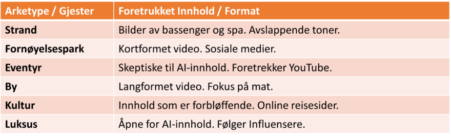 Studien identifiserte forskjellige arketyper for reisende og deres unike preferanser når det gjelder format, bilder og tone i reiseinnhold. Disse er tema Strand, Fornøyelsespark, Eventyr, By, Kultur og Luksus.