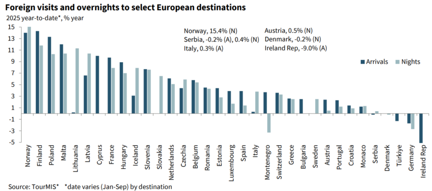 Europeisk reiseaktivitet har økt i 2025. Totalt antall utenlandske ankomster til Europa økte med 1,4% i første kvartal, 4,9% i andre og 3,5% i tredje kvartal sammenlignet med 2024. Inngående reiser til Europa fortsetter å øke i 2025, og forventes å stige med 5,3%. En majoritet av destinasjonene rapporterer sterkere reiseetterspørsel fra Nord-Amerika. Det har vært høyest vekst til Norge, både i antall ankomster (+14%) og antall netter (+15%) det siste året.