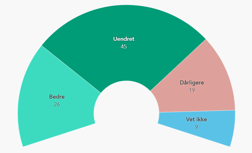 På landsbasis vurderer nå 40% markedssituasjonen som god, 48% som tilfredsstillende og kun 10% som dårlig. Dessverre kommer Troms og Finnmark dårligst ut, hvor 27% vurderer markedssituasjonen som dårlig. De fleste tror på en god framtid. Nær halvparten tror markedsutsiktene blir bedre det neste halve året, mens 40% tror situasjonen blir den samme og 10% venter en forverring.