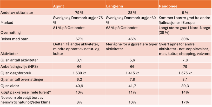 - Skituristene deles inn i tre hovedsegmenter: Alpint, Langrenn og Randonee