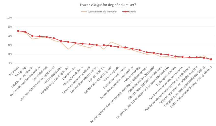 Å nyte livet og slappe av er aller viktigst, også for spanjolene. De scorer over gjennomsnittet på begge variabler, noe de gjør for de fleste av variablene. Å få oppleve lokal kultur og historie er viktig for dem, og de scorer høyest av samtlige markeder. De scorer også langt over gjennomsnittet når det gjelder å fordype seg i kunst og kultur. De synes at å komme tett på lokalbefolkningen og tilbud tilrettelagt barnefamilier er viktigere enn noen av de andre markedene.