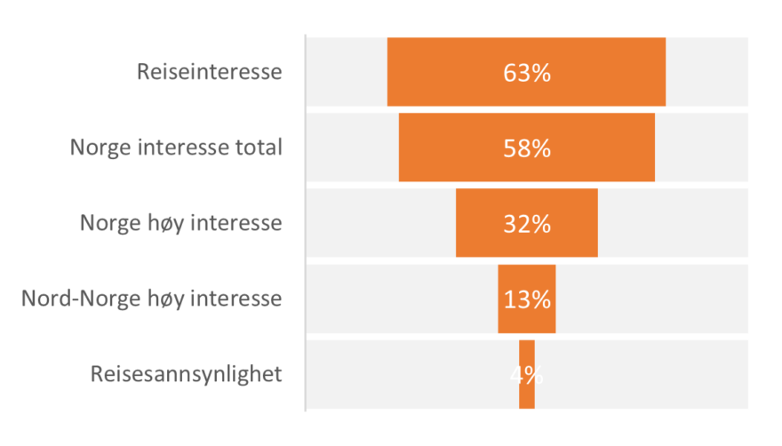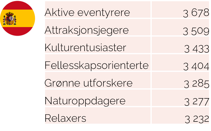 Spanjolene har den høyeste interessen for Norge med 58%. 13% har høy interesse for å reise til Nord-Norge og reell reisesannsynlighet beregnes til 4% (justert for barrierer mot å reise – reisetid, temperatur og pris). 3% har høy interesse for å reise til Svalbard. Det er Aktive eventyrere som har størst interesse både for Nord-Norge og Svalbard.