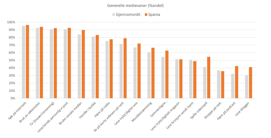 Spanjolene ligger på gjennomsnitt når det gjelder bruk av internett og søkemotorer. De leser også mer trykte/digitale aviser, strømmer mer musikk, spiller mer videospill, hører mer på podcast og leser mer blogger enn gjennomsnittet.