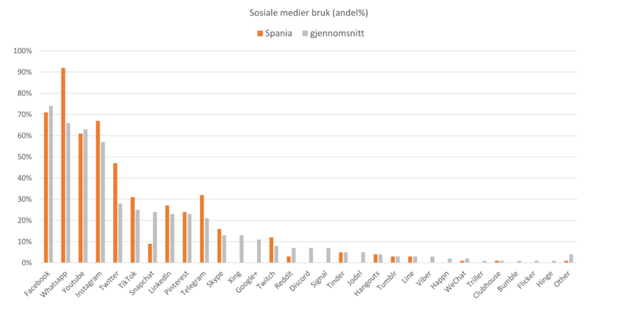 De bruker også mer sosiale medier enn gjennomsnittet. Flere enn 9 av 10 spanjoler bruker Whatsapp, det høyeste av alle markeder Mindshare har målt. Deretter kommer Facebook, Instagram (nest høyest bruk sammen med nordmenn) og YouTube. Nesten halvparten av spanjolene bruker Twitter, noe som er langt over gjennomsnittet og desidert høyest bruk av alle markeder. De har også over gjennomsnittlig bruk av TikTok. Sammen med italienerne har de også høy bruk av Telegram Messenger.