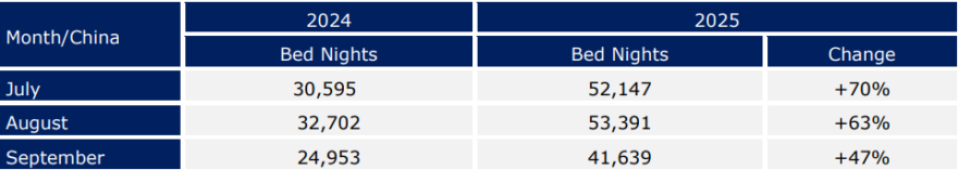 Det var en fortsatt positiv og stabil vekst i antall kinesiske overnattinger i Norge i tredje kvartal. Sammenlignet med 2024 økte antall overnattinger med 70% i juli, 63% i august og 47% i september.
