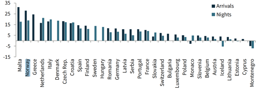 Oxford Economics kommer hvert kvartal ut med status, trender og utsikter for reiselivet. Økningen i antall reiser fortsetter stort sett over hele verden. Internasjonale ankomster til Europa lå i mars 2% over 2019-nivå, og forventes å ligge 3% over ved årsslutt. Norge har hatt en økning fra utlandet på nesten 30% i ankomster og ca. 20% i overnattingsdøgn per mars 2024, sammenlignet med året før.