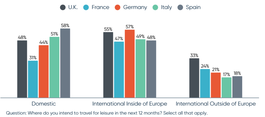 Selv om korttidsleie er på fremmarsj, foretrekker de fleste reisende fortsatt tradisjonelle hoteller. Franske og spanske reisende er mer tilbøyelige enn andre til å benytte korttidsleie. OTA-er er den viktigste bestillingskanalen for både fly og hotell i de fleste land, med unntak av Storbritannia, der flybestillinger like ofte gjøres via leverandørers nettsider. Bekvemmelighet og pris er mest avgjørende for valg av bestillingskanal. De mest populære reiseaktivitetene inkluderer naturopplevelser (spesielt for briter og tyskere), museer/kulturelle attraksjoner og guidede turer (mest populært blant italienere og spanjoler).