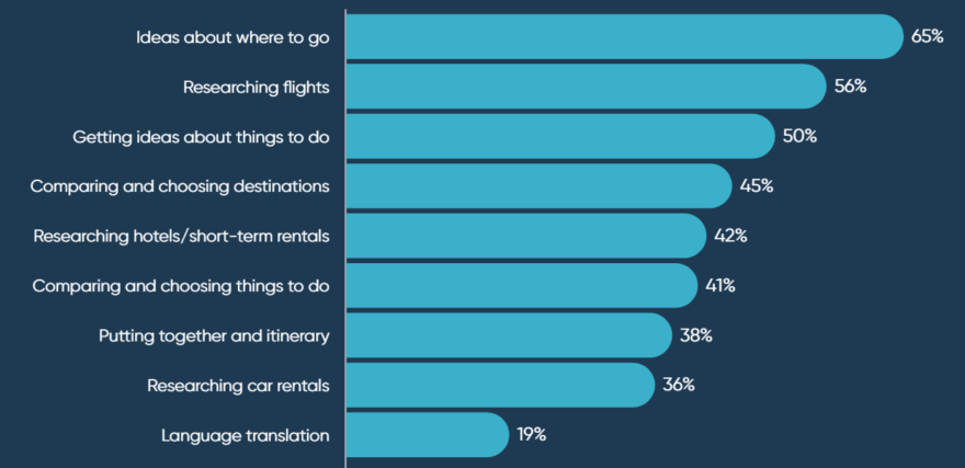 18% av de reisende benytter generativ AI når de skal ut å reise. 65% av disse bruker det for å finne ideer om hvor de skal dra. 41-50 % bruker det til å få ideer om ting å gjøre og aktivt sammenligne og ta reisevalg. Halvparten forventer å benytte generativ AI i forbindelse med fritidsreiser i løpet av de neste 12 månedene.