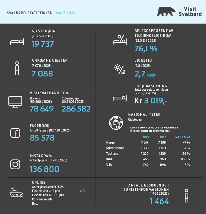 Sammenstiller vi overnattingstallene mot salget av aktiviteter, så ser vi også der tall omtrent som i mars 2025 – altså høy aktivitet og god omsetning. I sum har det derfor vært en god mars måned for reiselivet i Longyearbyen. Cruisesesongen er i gang for de mindre ekspedisjonsskipene, og Svalbard har i løpet av mars hatt fem anløp med fullt belegg.