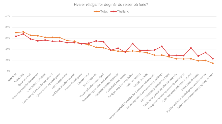 Aller viktigst for thailenderne er å slappe av og å ha tid for seg selv. De er miljøbevisste og scorer over snittet når det gjelder å ta vare på natur og miljø, bidra til bærekraftig utvikling og ha lengre ferieopphold i fremtiden for å redusere klimaavtrykket. De scorer også godt over gjennomsnittet når det kommer til fysisk krevende aktiviteter i naturen og å fordype seg i kunst og kultur.