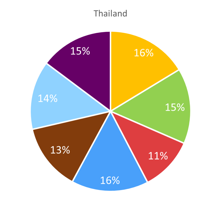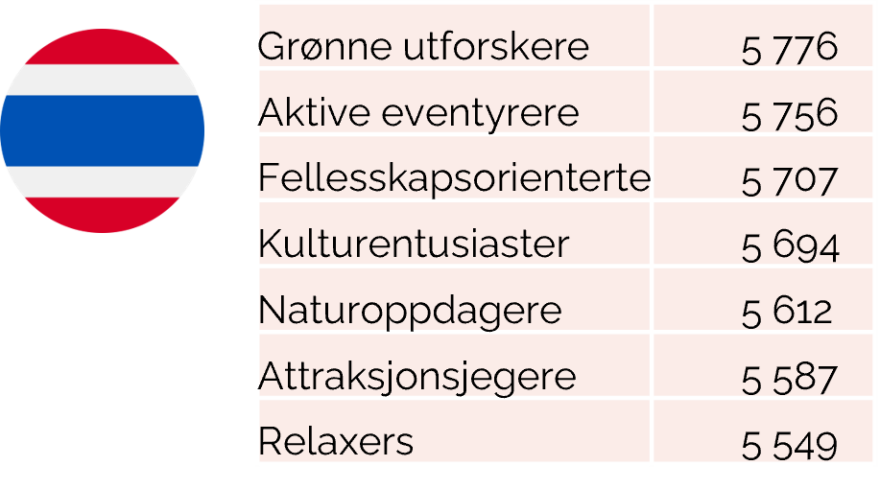 Målgruppene er jevnt fordelt i det thailandske markedet. Relaxers og Aktive eventyrere utgjør begge 16%, og har dermed den største andelen.