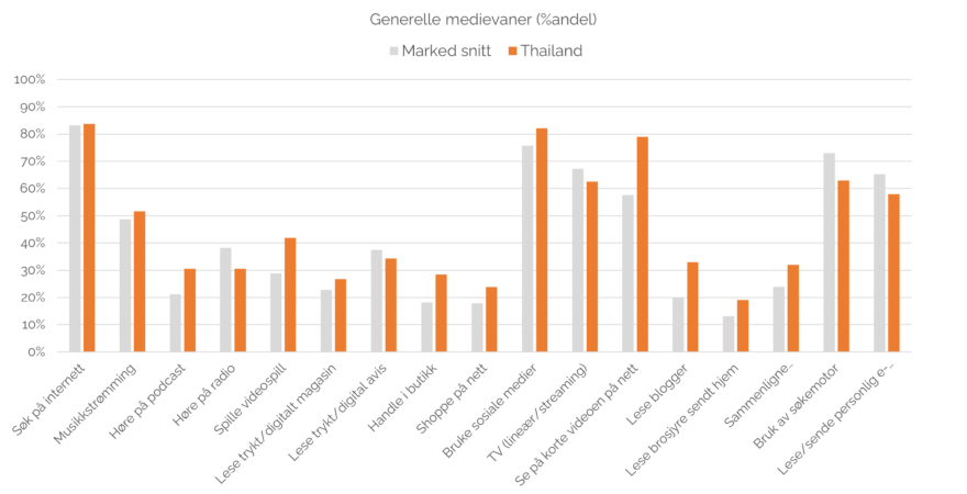 Thailenderne bruker generelt mye tid på medier. De ligger på gjennomsnittet når det kommer til søk på internett. De ser mer videoer på nett, hører mer på podcast, spiller mer videospill, og shopper mer (både i butikk og på nett) enn snittet.