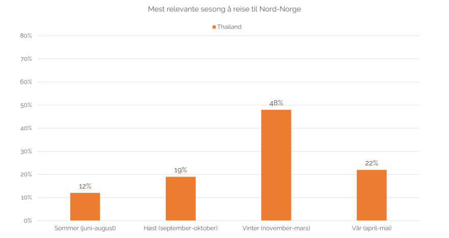 Det er nesten 6,5 millioner thailendere som har høy interesse i å reise til Nord-Norge og drøyt 1 million til Svalbard. Halvparten sier at dersom de skulle reise til Nord-Norge, ville de mest sannsynlig gjøre det allerede neste år. 28% sier de ville ha reist i løpet av de neste 2 – 3 årene.