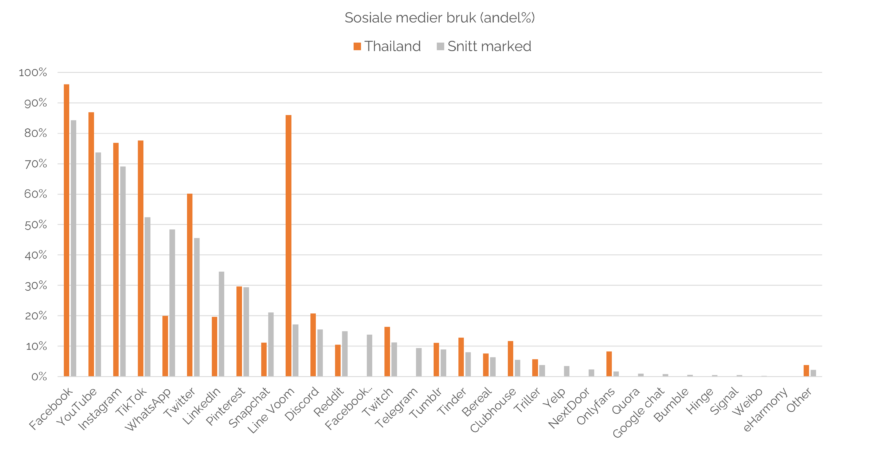 De ligger også litt over gjennomsnittet når det gjelder bruk av sosiale medier. På topp ligger Facebook med hele 96%. Deretter følger YouTube med 87% og Line Voom (plattform for deling av korte videoer) med 86%, langt over gjennomsnittet for alle disse. De bruker også mer Instagram, TikTok og Twitter enn snittet.