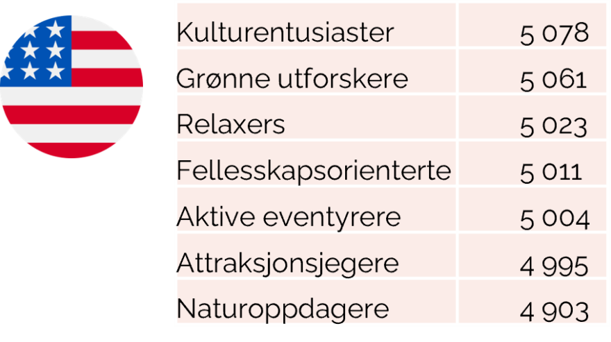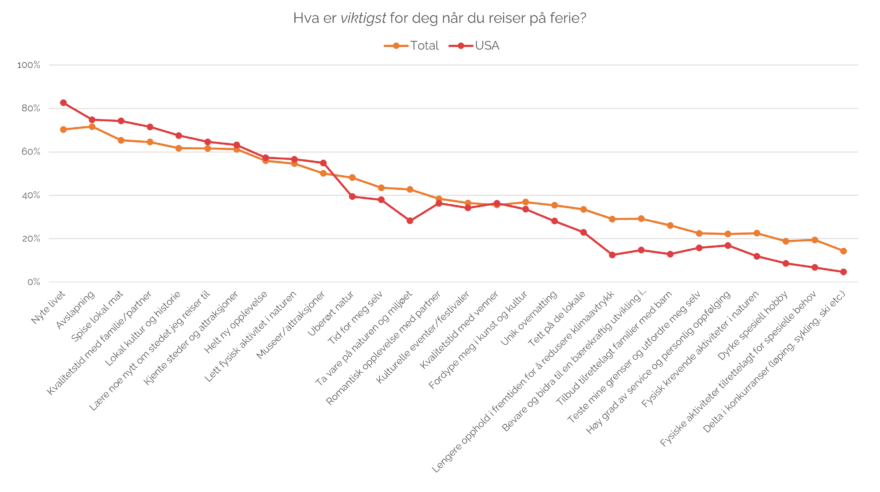 Amerikanerne verdsetter spesielt å nyte livet og å slappe av. De ønsker også å spise lokal mat, ha kvalitetstid med partner/familie, oppleve lokal kultur og historie, og lære noe nytt om reisemålet. De ligger godt over gjennomsnittet for disse variablene.