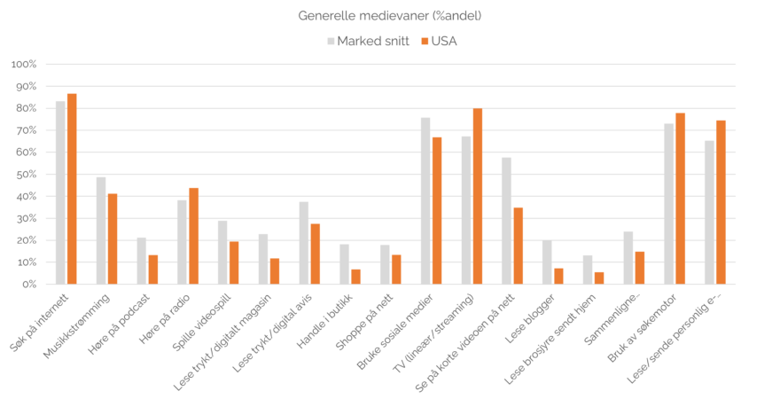 De aller fleste amerikanere er mye online. De ligger litt over gjennomsnittet når det gjelder bruk av internett og søkemotorer. De ser også mye på TV, og hører mer på radio og sender mer e-post enn gjennomsnittet.