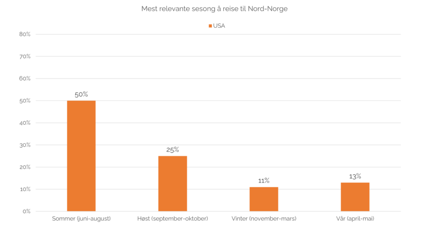 42% av det amerikanske markedet er interessert i å reise på ferie til Norge. 6% har høy interesse for å reise til Nord-Norge og reell reisesannsynlighet beregnes til 2% (justert for barrierer mot å reise). 1% har høy interesse for å reise til Svalbard. Det er de Grønne utforskerne som har størst interesse både for Nord-Norge og Svalbard, etterfulgt av Aktive eventyrere for Nord-Norge og Naturoppdagere for Svalbard.