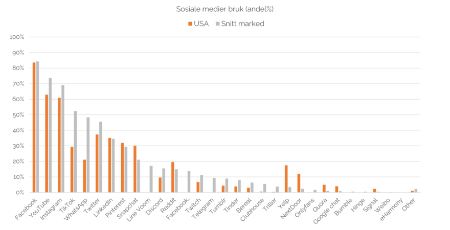 De bruker imidlertid sosiale medier i mindre grad enn gjennomsnittet, spesielt YouTube, Instagram, WhatsApp, Twitter og TikTok (mer enn halvparten av de amerikanske statene har forbudt appen fra offisielle enheter). Over 80% bruker likevel Facebook. Over 60% bruker YouTube og Instagram, og 30% Snapchat, som er over gjennomsnittet for de fem markedene i denne undersøkelsen.