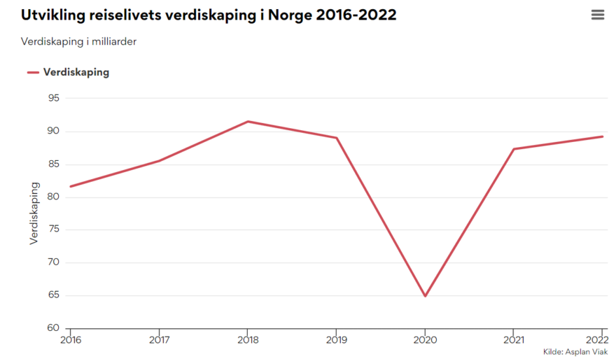 Verdiskaping er summen av driftsresultat og lønnskostnad hvis driftsresultatet ikke er negativt. Hvis driftsresultatet er negativt, blir verdiskaping satt lik lønnskostnader. I 2022 var total verdiskaping på 89 milliarder kroner, det samme som i 2019. Det er en sammenheng mellom økt verdiskaping og økning i kommersielle overnattinger.